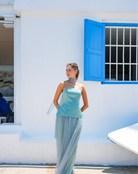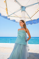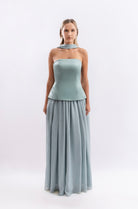 Two-piece set featuring a structured, strapless corset-style top with a flattering peplum cut, paired with a flowy, high-waisted maxi skirt. Styled with a matching neck scarf for a soft, feminine touch — perfect for elegant summer occasions.