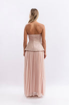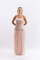 Two-piece set featuring a structured, strapless corset-style top with a flattering peplum cut, paired with a flowy, high-waisted maxi skirt. Styled with a matching neck scarf for a soft, feminine touch — perfect for elegant summer occasions.
