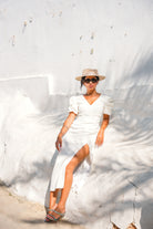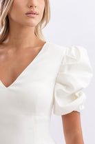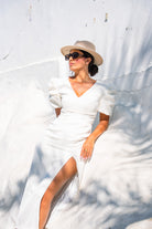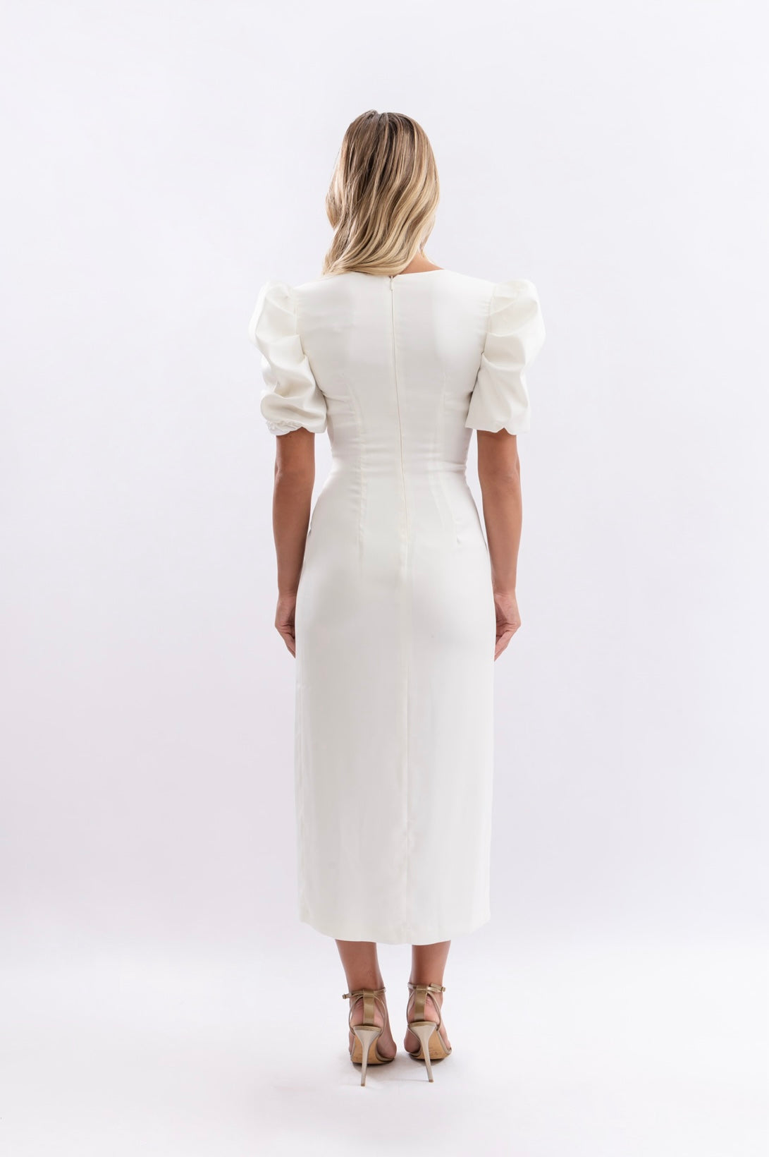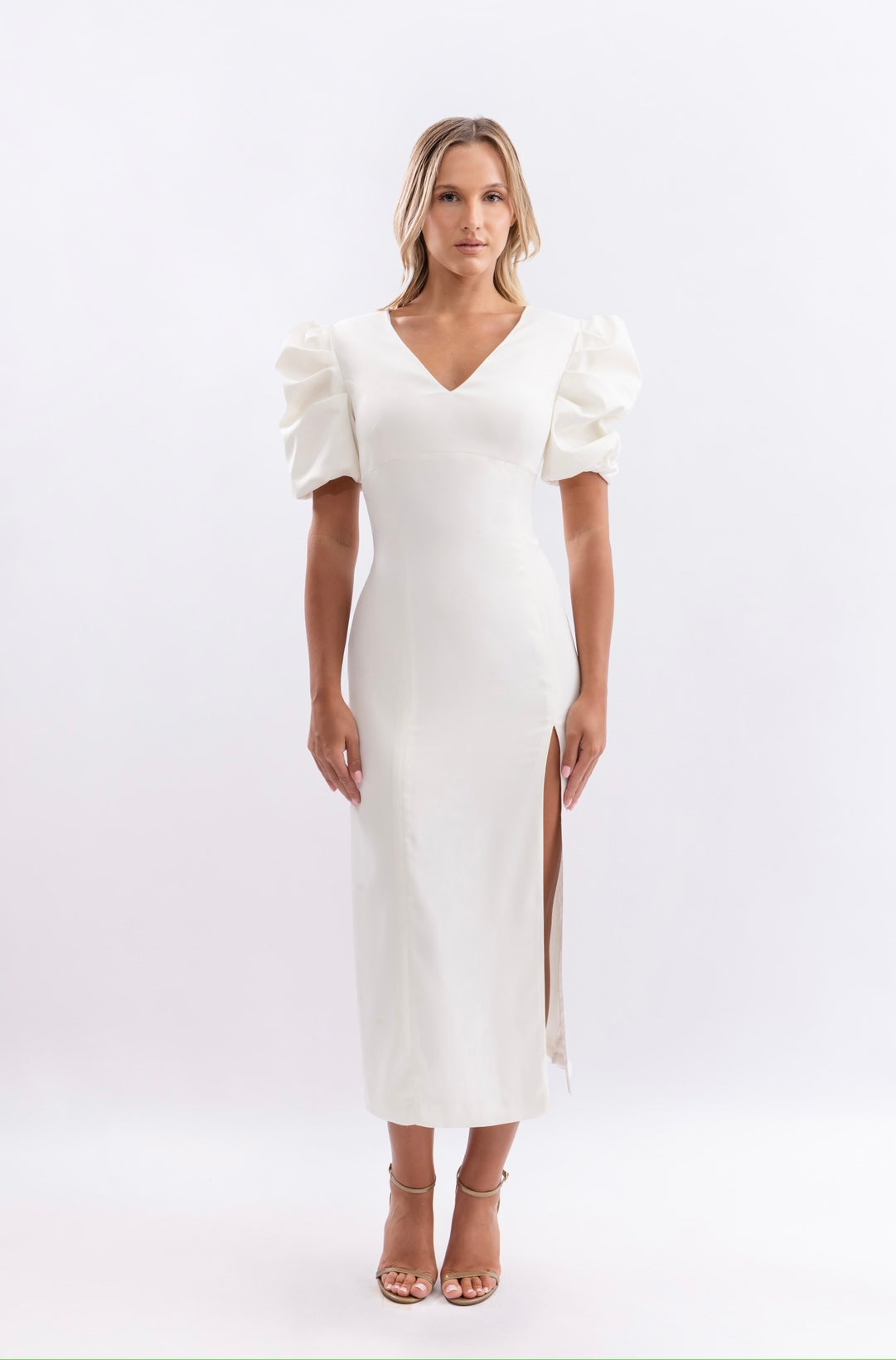 Chic midi dress with puff sleeves and a daring thigh-high slit—modern elegance for any occasion.
