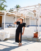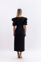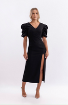 Chic midi dress with puff sleeves and a daring thigh-high slit—modern elegance for any occasion.