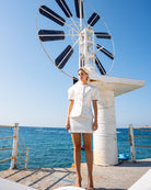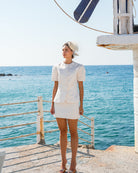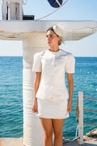 Structured two-piece set featuring a short-sleeve tailored blazer with matching mini skirt. Elegant, minimal, and perfect for chic summer events or bridal occasions.