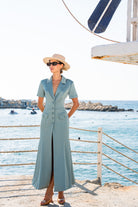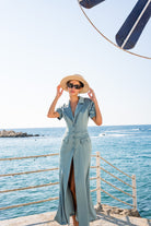 Elegant ocean blue midi dress with short sleeves, button details, and a tailored fit, perfect for sunny coastal days.