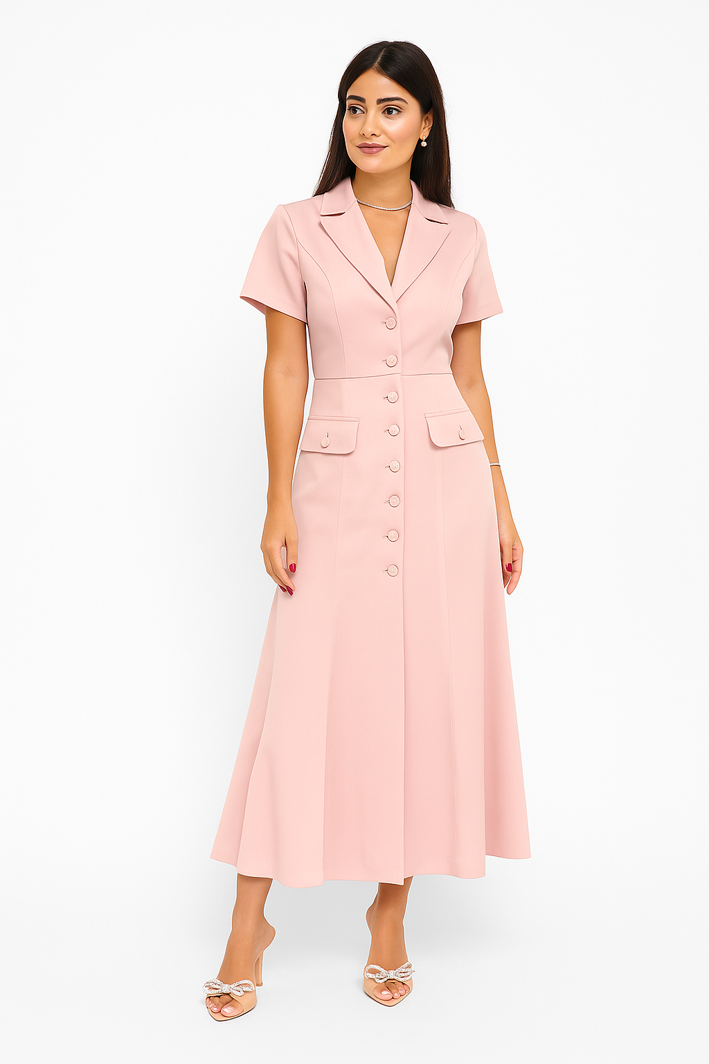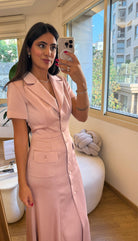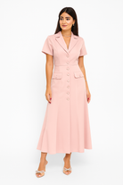 Elegant soft pink midi dress with short sleeves, button details, and a tailored fit, perfect for sunny coastal days.